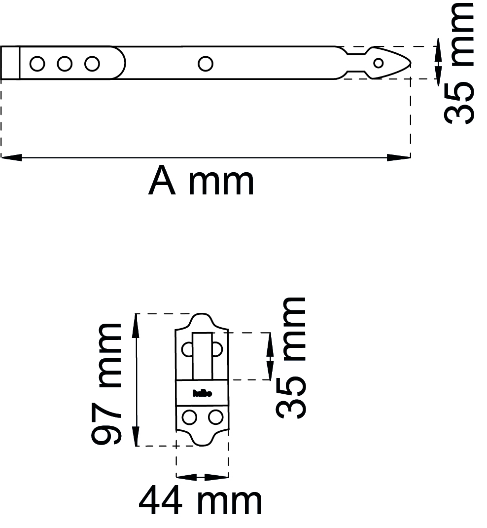 Stabelhængsel af stål. Ø12 mm tap. 35x3mm. 1 sæt består af 2 stk. hængsler samt 2 stk. stabler. Leveres med skruer.