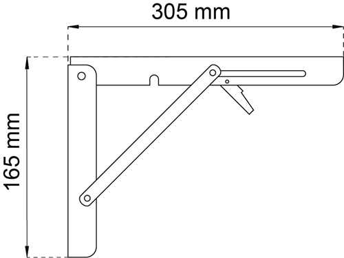 Hyldeknægt sammenklappelig i hvidlakeret stål. Mål: 305 x 165 mm. Anbefalet maxbelastning på 75 kg. er anslået og garanteres ikke. Leveres i en 1 styks forpakning.