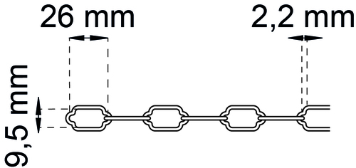 Kæde af stål. 25,5x14 mm. Maxbelastning 13 kg. (De angivende værdier for anbefalet belastning er anslåede og garanteres ikke). Forpakningen indeholder 2 meter.
