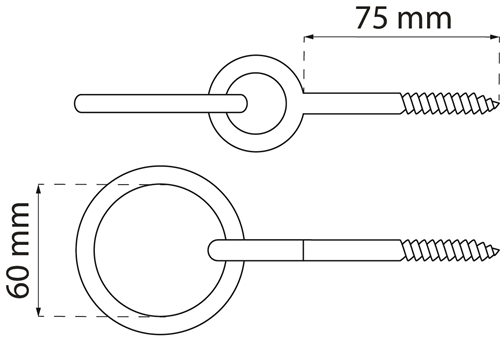 Øsken af stål med trægevind og med svejset ring. Ø 60 mm, tykkelse 8 mm. Længde 75 mm, 10 mm trægevind. Maxvægt 100 kg. De angivne værdier for anbefalet maxbelastning er anslåede og garanteres ikke.