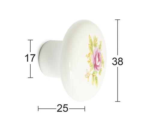 Møbelknop i porcelæn med dekor. Ø: 38 mm. Fremspring: 25 mm. Skrue medfølger. Leveres i en 2 styks pakning. Klassisk knop til låger og skuffer.
