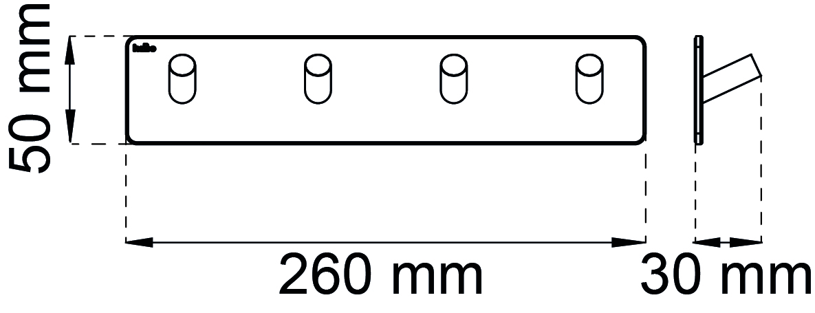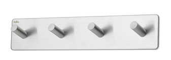 Knagerække med 4 knager i selvklæbende rustfrit stål. Mål: 260 x 50 mm. Leveres i en 1 styks forpakning.