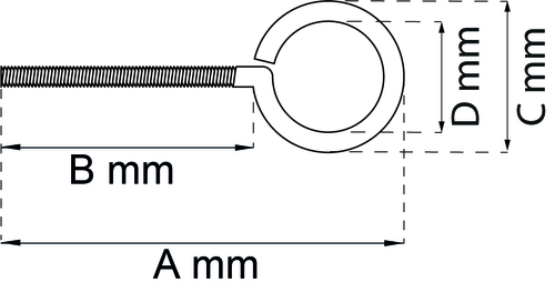 Øsken af stål. De angivne værdier for anbefalet maxbelastning er anslåede og garanteres ikke. A=total længde, B=længde skrue, C=udvendig diameter, D= indvendig diameter. Artikel 13618, 13621, 13622, 13623, 13624, 13625, 13626, 700335 og 700337 sælges, kun i hele colli.
