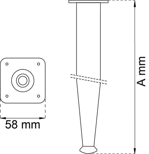 Konisk bordben lavet af stålrør med fast monteringsplade. Børstet look. Bordbenet har en diameter på 25 mm øverst og 13 mm i bunden. Den indbyggede stilleskrue gør, at højden kan justeres ca. 10mm for at kompensere for ujævne overflader. Kan monteres på møbelhjul type 1175.