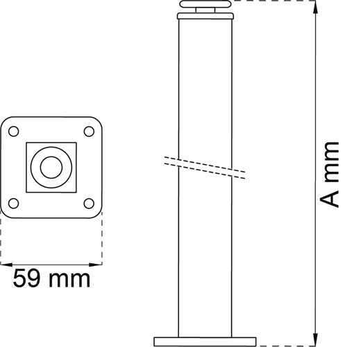 Pöydänjalka neliöteräsputkea 25 x 25 mm. Korkeus säädettävissä epätasaisen alustan kompensoimiseksi, maksimikorkeus 10 mm. Tämä tekee pöydästä vakaan. Voidaan asentaa myös kalustepyörään 1175.