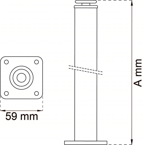 Pöydän jalka pyöreää teräsputkea, ø 30 mm. Korkeus on säädettävissä max. 10 mm epätasaisen alustan kompensoimiseksi. Tämä tekee pöydästä vakaan. Voidaan asentaa myös kalustepyörään 1175.