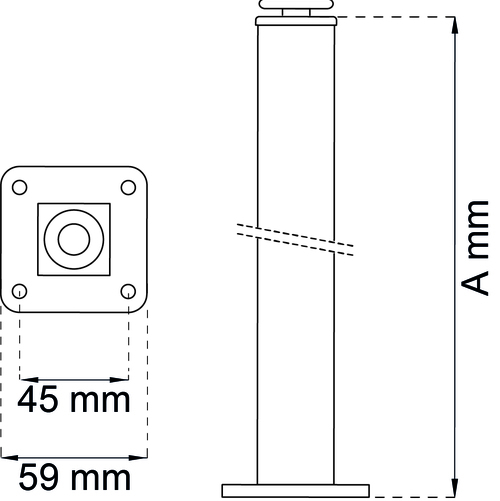 Pöydänjalka neliöteräsputkea 25 x 25 mm. Korkeus säädettävissä epätasaisen alustan kompensoimiseksi, maksimikorkeus 10 mm. Tämä tekee pöydästä vakaan. Voidaan asentaa myös kalustepyörään 1175.