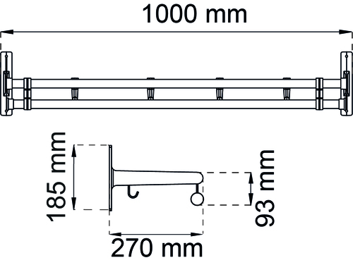 Tyylikäs naulakko, päädyt ja 4 koukut alumiinia. Tangot tammea. Lisätanko vaatteille, suunniteltu vaatteiden, hattujen ja kenkien säilytykseen. Toimitus osina. Hyllyn leveys 1 000 mm ja ulkonema 270 mm.