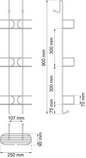Kolmihyllyinen suihkukori, joka ripustetaan suihkuseinän päälle. Viiden vuoden ruostumattomuustakuu.