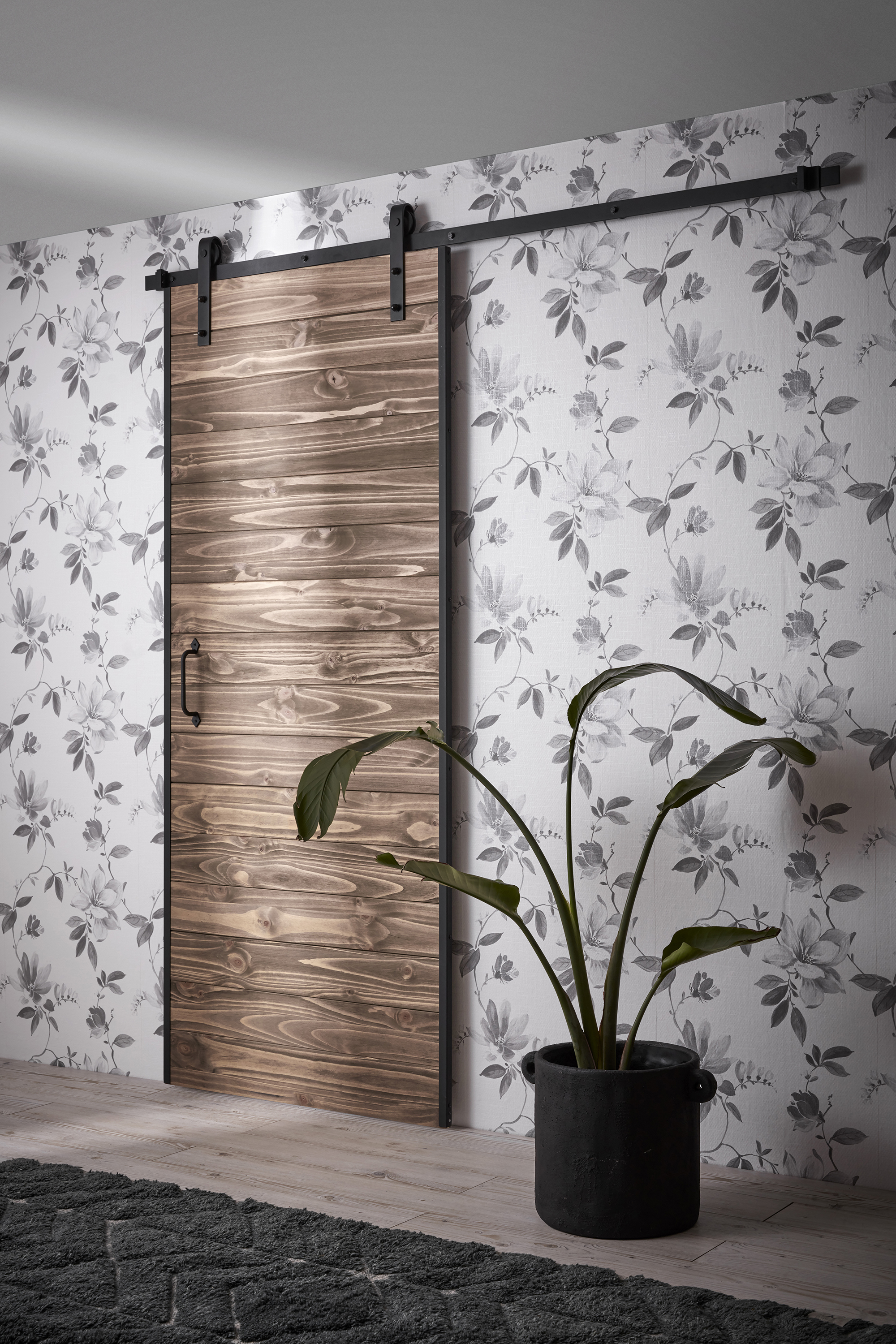 Ovi mustalla sivulistalla käsittelemätöntä mäntypaneelia vaakatasossa, kokoamaton. Käsittelemällä oven öljyllä, lakalla, petsillä tai maalaamalla, saat luonteikkaan pinnan oveesi. Vain mielikuvitus asettaa rajat.
