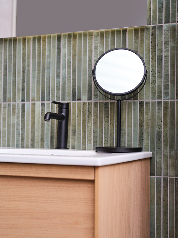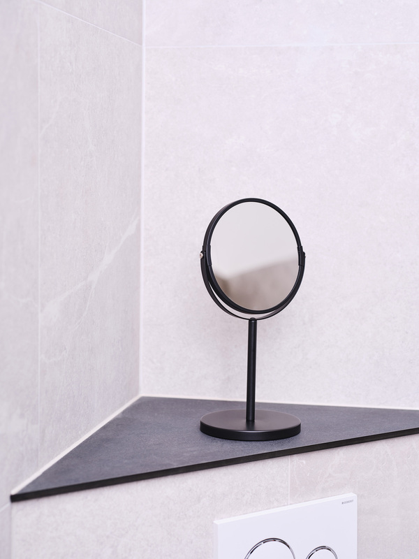 Dobbeltsidig dreibart speil med bordstativ. Stilren design. Den ene siden av speilet har en bildeforstørrelse på 3x. Perfekt til for eksempel sminke eller barbering. Vekt i bunnen for ekstra stabilitet. Høyde 350 mm, speildiameter 160 mm.