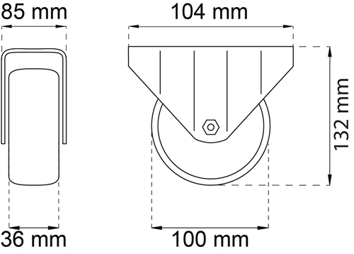 Fast containerhjul av stål og PUR (Polyuretan) Ø100 mm. Festeplate 85x104 mm. Maksbelastning 160 kg pr. hjul er veiledende og garanteres ikke.