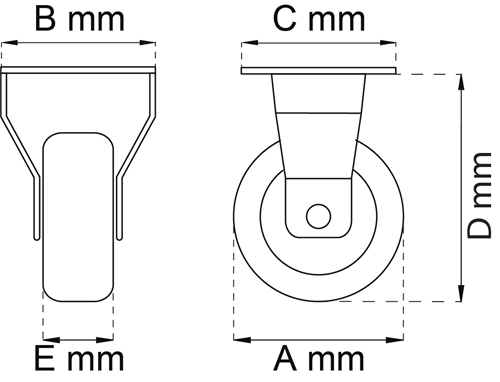 Festeplate av stål 60x60 mm. Hjul av PUR (Polyuretan) Ø100 mm. Maksbelastning 40 kg pr. hjul er veiledende og garanteres ikke.