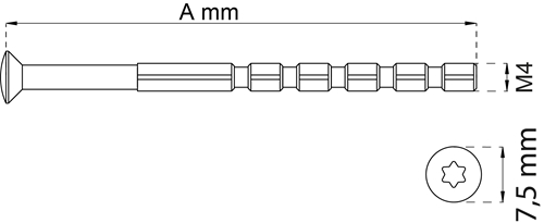 Avkappbar skrue av forniklet messing. M4 gjenget, Torx 10. Lengde 75 mm. Passer for gjennomgående innfesting av sylinderskilt i 316- serien. Leveres a 100 stk.