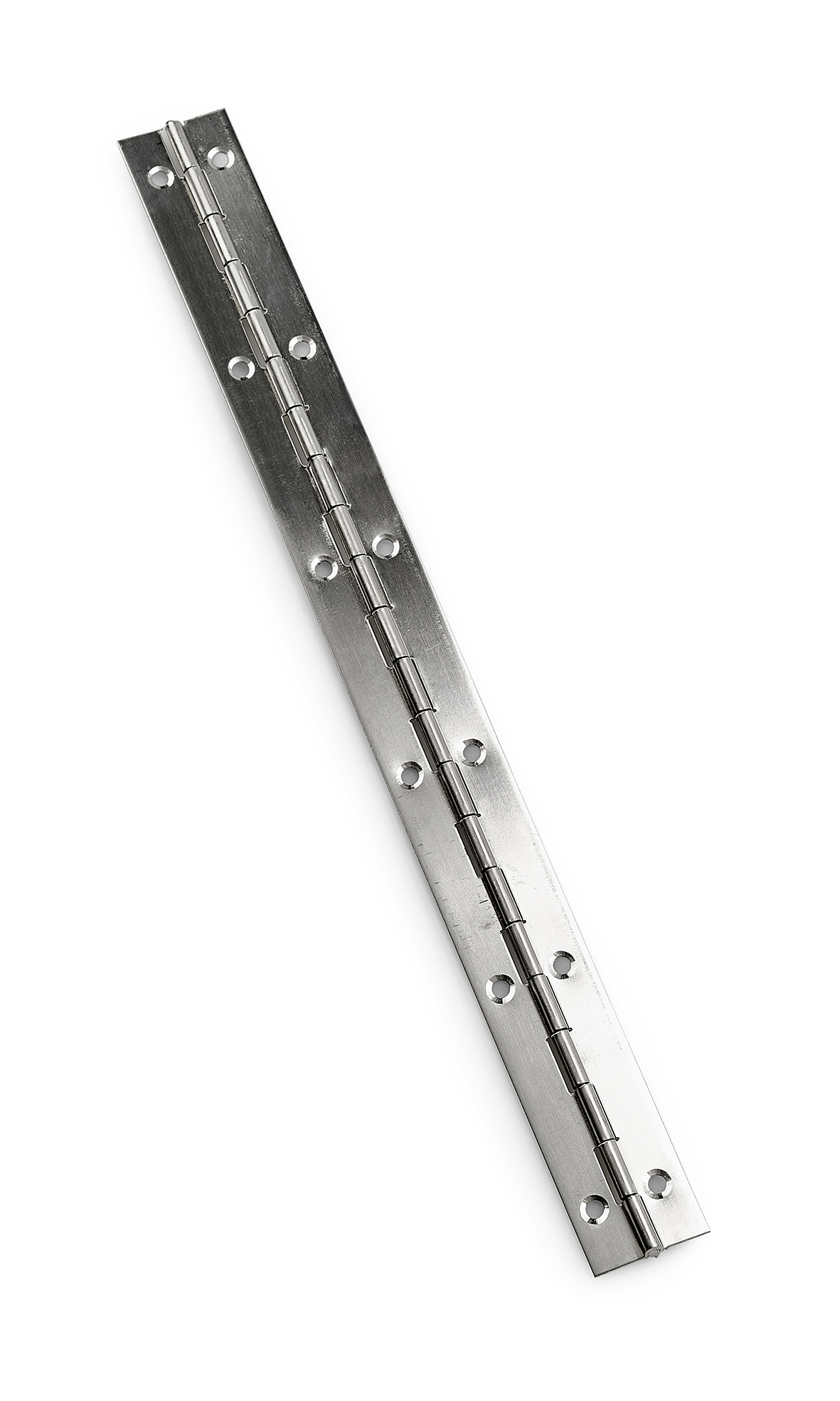 Pianohengsel og splint av polert rustfritt 201 stål. Godstykkelse 0,7 mm. Hulldiameter 4 mm. Leveres inkludert skruer.