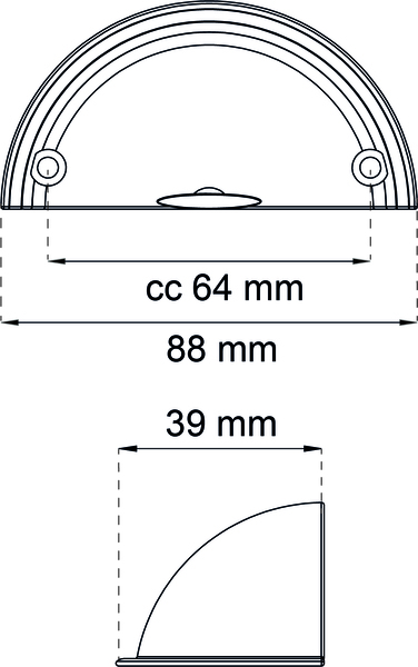 Møbelhåndtak av sink/zamak. Håndtaket har rund skålfasong og passer ekstra godt til skuffer i seksjoner og kommoder. CC64 mm. Høyde 40 mm. Leveres inkludert skruer. 2 stk. pr. pakke.