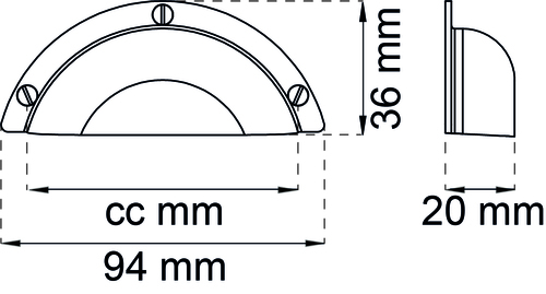 Møbelhåndtak produsert av gjenvunnet messing. Håndtaket har en rund skålform og passer utmerket til skuffer i skap og kommoder, men også til kjøkkenet. CC 64 mm. Lengde 94 mm. Høyde 36 mm. Skruer medfølger. 2 stk pr. pakke.