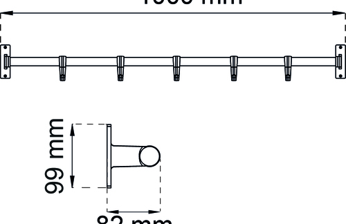 Krokrekke med feste og kroker av aluminium. Rør av plastbelagt stål. Leveres umontert. Bygger ut 82 mm. Rørdiameter 25 mm.
