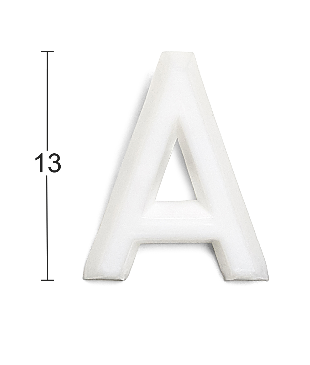 Bokstav A med brakett for festing på ujevn overflate. Høyde 13 mm. Leveres i pakker med 10 stk.
