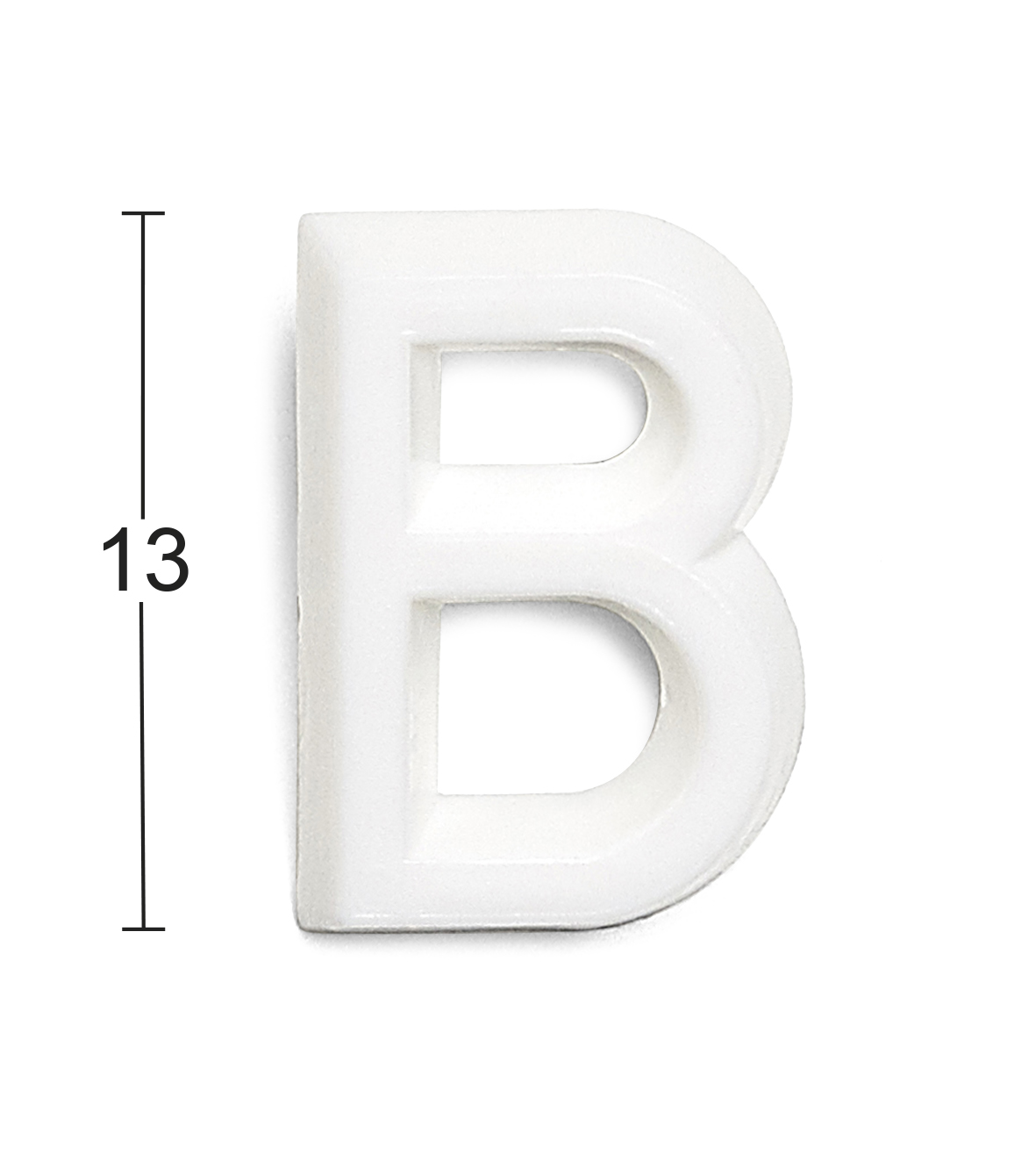 Bokstav B med brakett for festing på ujevn overflate. Høyde 13 mm. Leveres i pakker med 10 stk.
