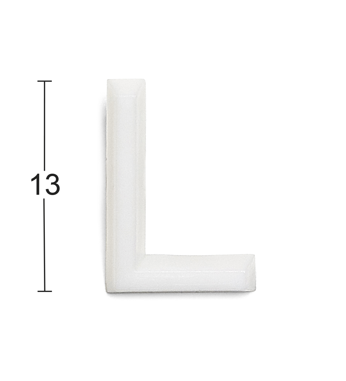 Bokstav L med brakett for festing på ujevn overflate. Høyde 13 mm. Leveres i pakker med 10 stk.