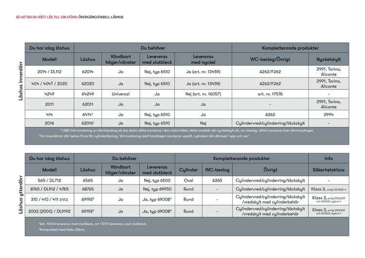 Dörrens tjocklek och låsets placering är de viktigaste måtten när du ska byta cylinder. Låshusets placering är viktigt då det kan vara nödvändigt att använda cylinderförlängare på den ena eller andra sidan av dörren. Rätt typ av cylinder för låshuset hittar du i övergångstabellen nedan.
