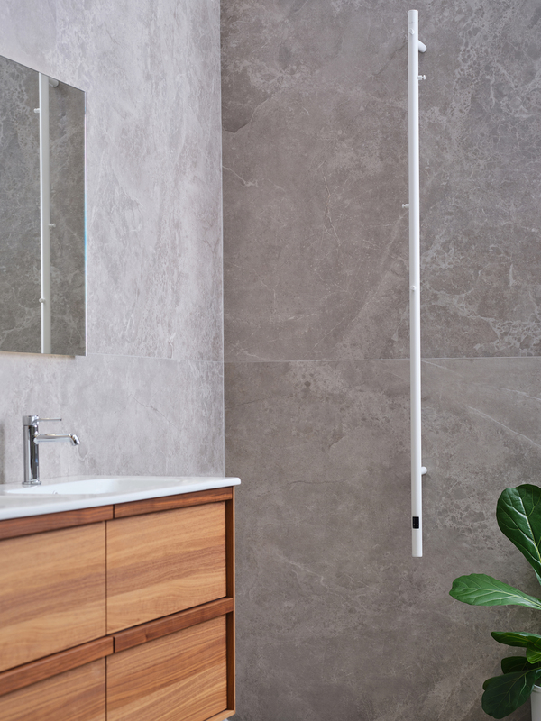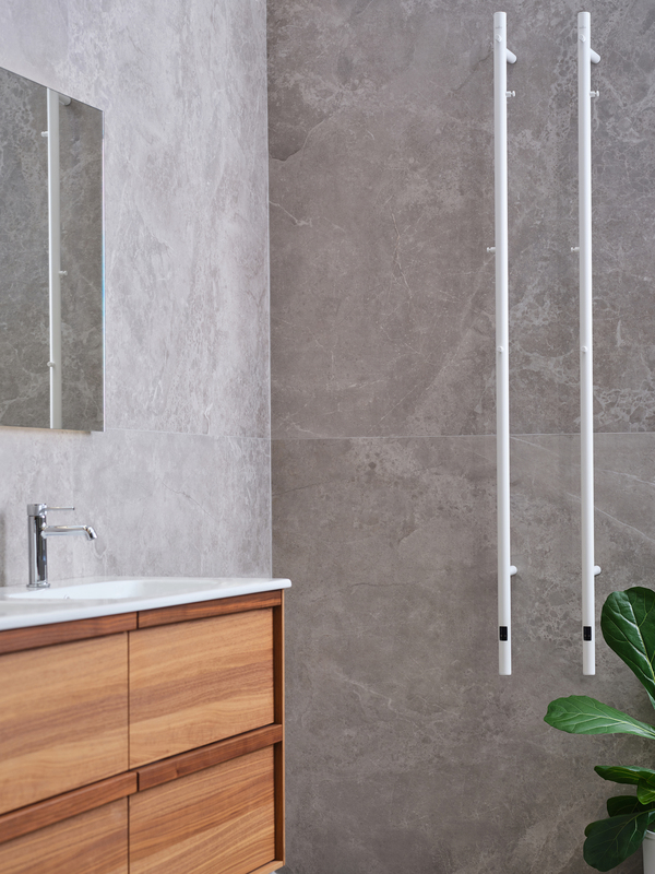 Handdukstork av rostfritt stål med fyra krokar. Med ledbelyst av-/på-knapp i underkant för en diskret look. Minska elförbrukningen med touchbar timer, 1-8 timmar. Ställbar temperatur, 30-70 grader. Går även att ställa i konstant läge. Effekt 45 W / 230 V. IP-klass 44. Levereras med stickkontakt. Monteringskit för dold anslutning säljes separat.