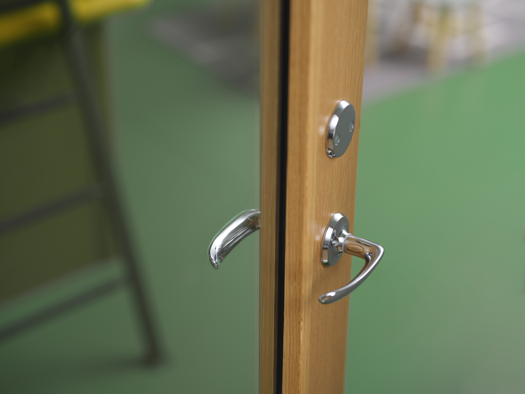Dörrhandtag av blyfri mässing med dubbelverkande returfjäder avsett för ytterdörrar med modullåshus. För dörrtjocklek 38-70 mm. Utsprång 55 mm.