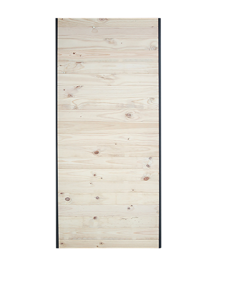 Dörr med svart u-profil. Liggande panel av obehandlad furu. Omonterad.